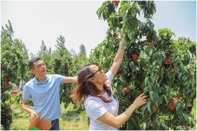徐村(岳家、大荒、小荒、周家庄)是“蜜桃”种植核心区,目前正值蜜桃硕果累累红遍整个桃园之际,受疫情和汛期的影响导致滞销。商会收到村委求助信息当天,经商会会长班子成员商讨后决定,以会员认养桃树的模式来帮助桃农售桃。大家不仅可以吃到绿色天然的蜜桃,又可以享受桃园采摘的乐趣。在商会秘书处热心联络下,仅用5天时间就认养了200多棵桃树,快速有效的解决了桃农售桃难问题。