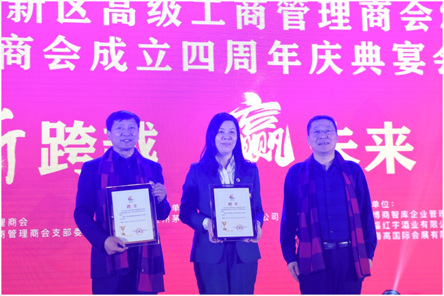 西海岸新区工商联副主席程宇宇代表商会为新增选副会长单位青岛市婚庆协会副会长、青岛印象酒店管理有限公司总经理苏华,西海岸新区工商联总商会副会长、青岛福红宇酒业有限公司总经理宋云庭授牌。