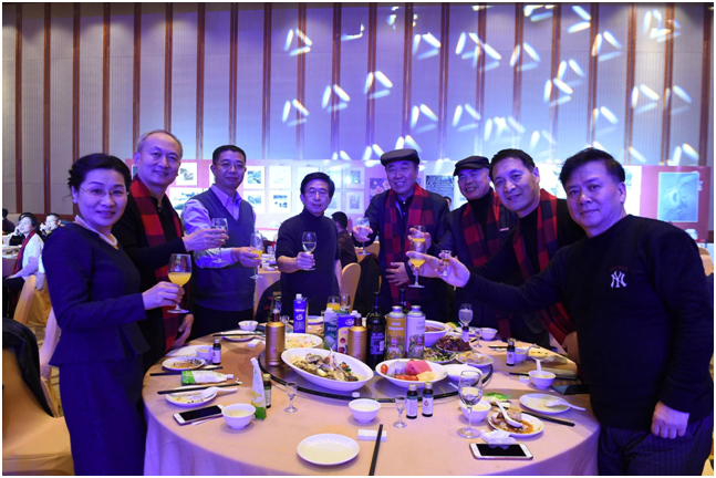 商会会长、党支部书记纪新磊,常务副会长李云峰,副会长韩宗祥、闫旭明、焦玮玮、苏华、宋云庭,秘书长王岩、监事长梅雪海共同上台为年会开幕祝酒